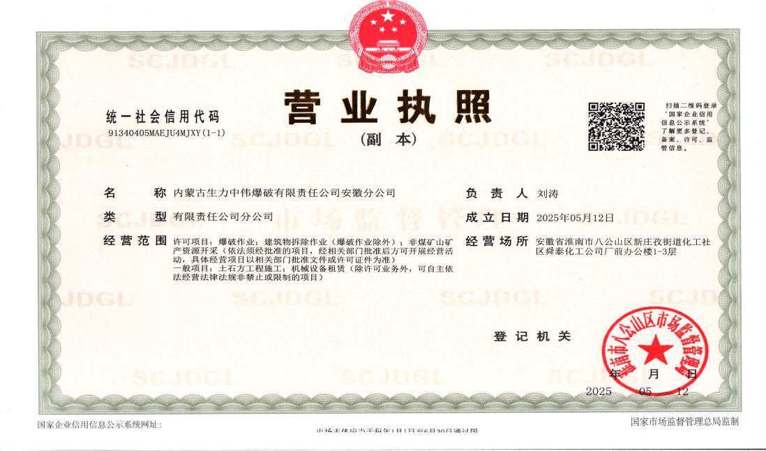 路虽远,行则将至;事虽难,做则必成。经过一番努力,内蒙古生力中伟爆破有限责任公司安徽分公司正式成立。
