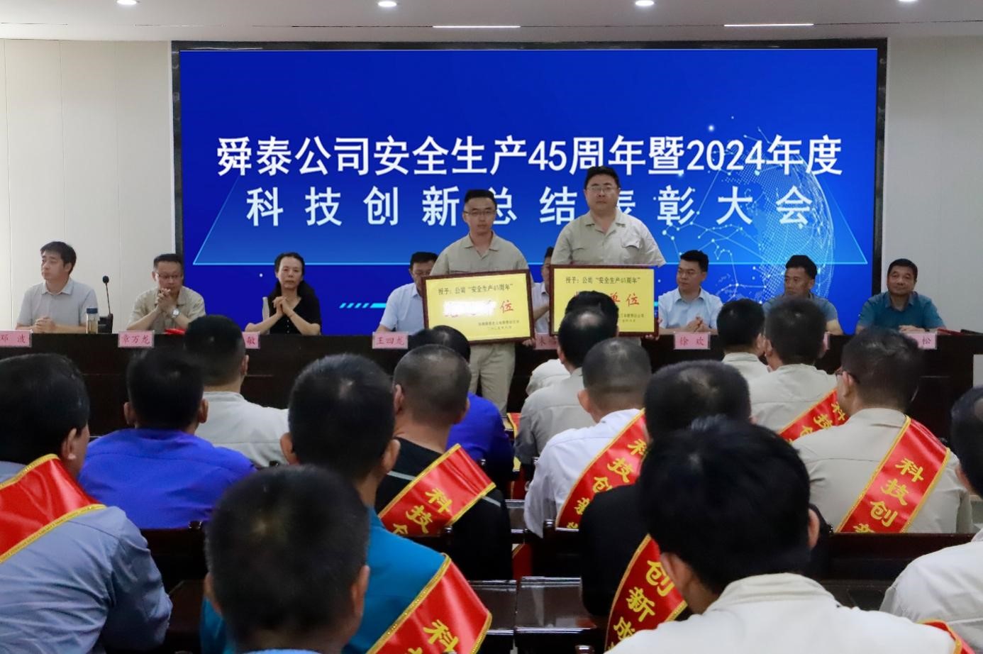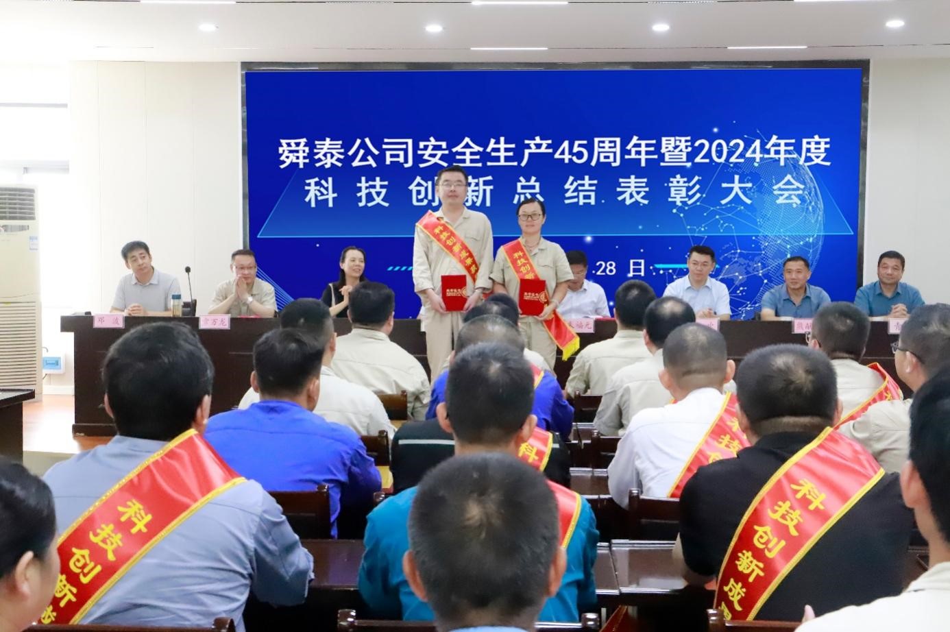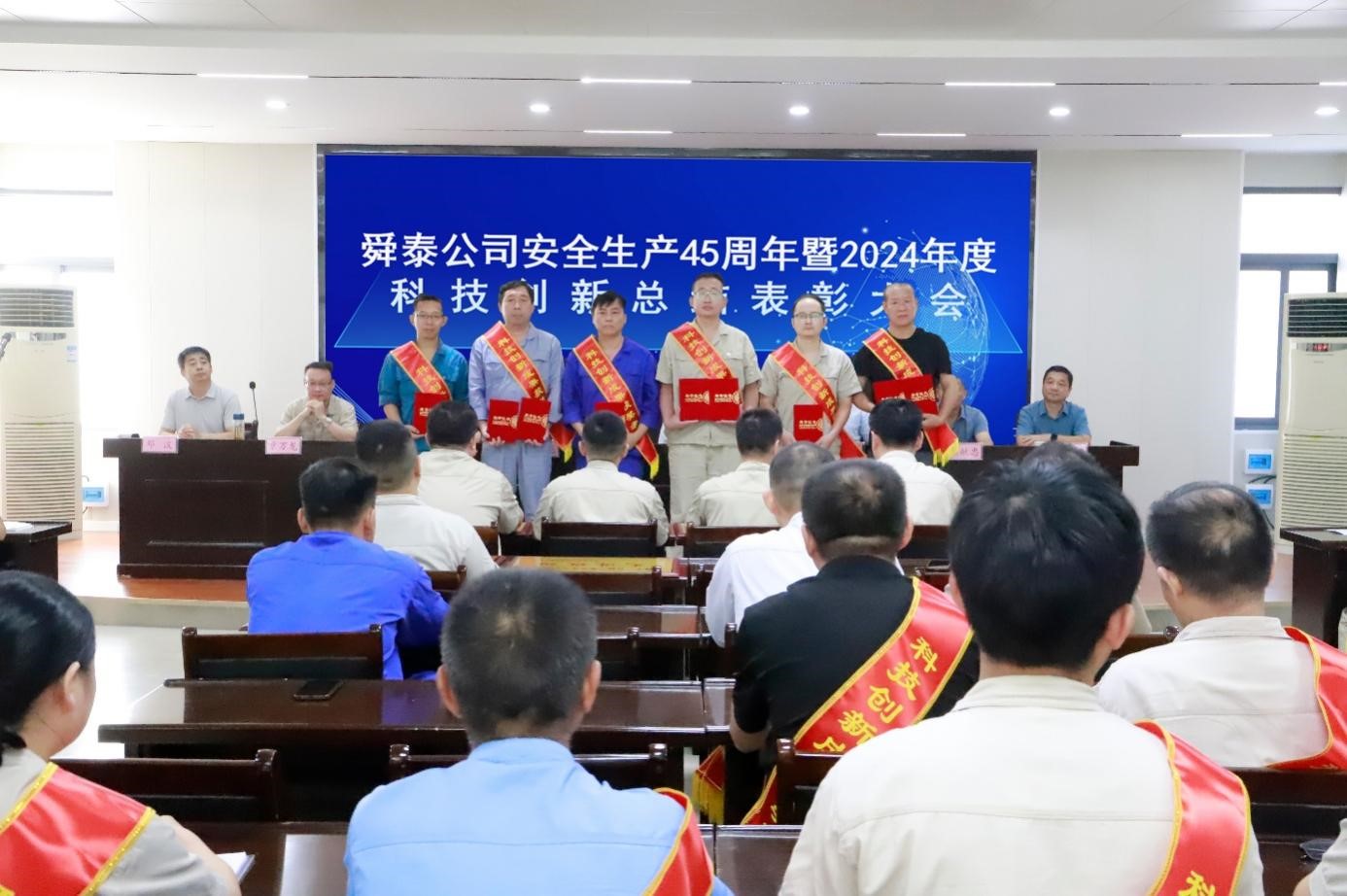 8月28日上午,舜泰公司在一号会议室隆重召开安全生产45周年暨2024年度科技创新总结表彰大会。公司党委书记、董事长王四龙主持会议。